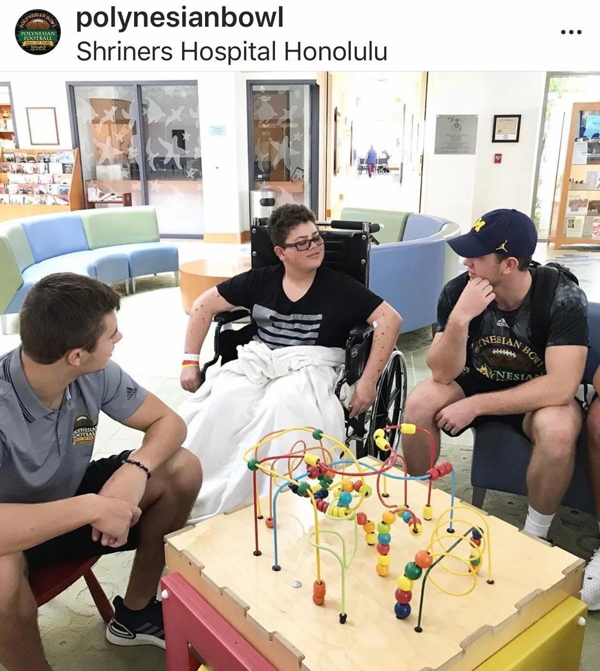 The game is broadcast live on the CBS Sports Network, but you’ll have to stay up late or set the recorder. 7 pm is the start time… local Hawaii time. That’s midnight for all of us stuck in the snowy midwest. While practicing this week at Aloha stadium in preparation for the game, Gregory has also had time to be introduced to the Polynesian culture and visit the Shiners Hospital in Honolulu.